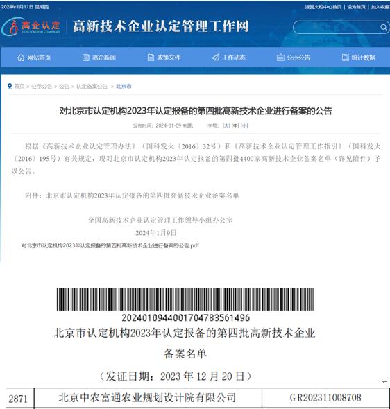 2024年1月9日,全國(guó)高新技術(shù)企業(yè)認(rèn)定管理工作領(lǐng)導(dǎo)小組辦公室對(duì)北京市認(rèn)定機(jī)構(gòu)2023年認(rèn)定報(bào)備的第四批高新技術(shù)企業(yè)進(jìn)行了備案公示,北京中農(nóng)富通農(nóng)業(yè)規(guī)劃設(shè)計(jì)院有......
