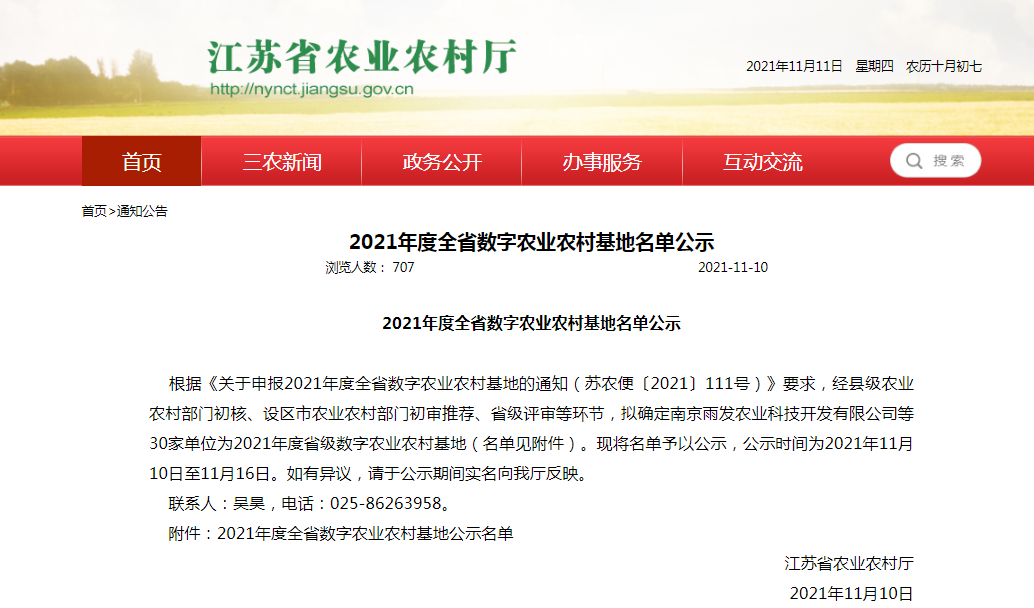 根據(jù)《關(guān)于申報(bào)2021年度全省數(shù)字農(nóng)業(yè)農(nóng)村基地的通知(蘇農(nóng)便〔2021〕111號(hào))》要求,經(jīng)縣級(jí)農(nóng)業(yè)農(nóng)村部門初核、設(shè)區(qū)市農(nóng)業(yè)農(nóng)村部門初審?fù)扑]、省級(jí)評(píng)審等環(huán)節(jié),......