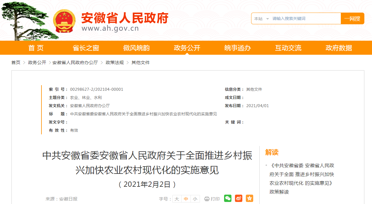 中共安徽省委安徽省人民政府關(guān)于全面推進鄉(xiāng)村振興加快農(nóng)業(yè)農(nóng)村現(xiàn)代化的實施意見...