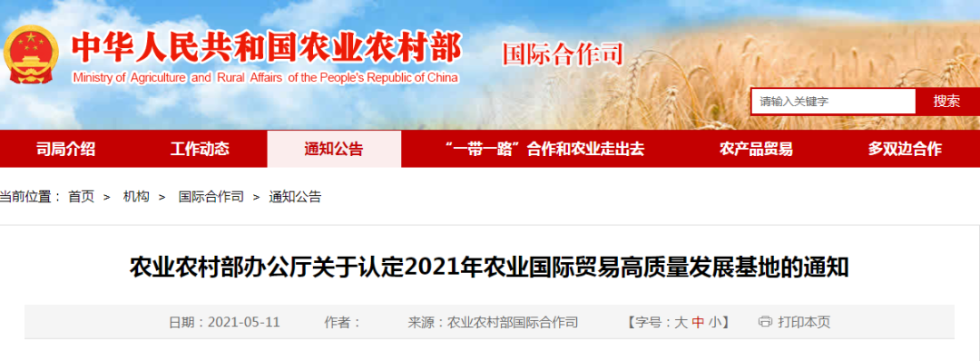 農(nóng)業(yè)農(nóng)村部辦公廳關(guān)于認(rèn)定2021年農(nóng)業(yè)國際貿(mào)易高質(zhì)量發(fā)展基地的通知各省、自治區(qū)、直轄市農(nóng)業(yè)農(nóng)村(農(nóng)牧)、畜牧獸醫(yī)、海洋漁業(yè)廳(局、委),新疆生產(chǎn)建設(shè)兵團農(nóng)業(yè)農(nóng)村......