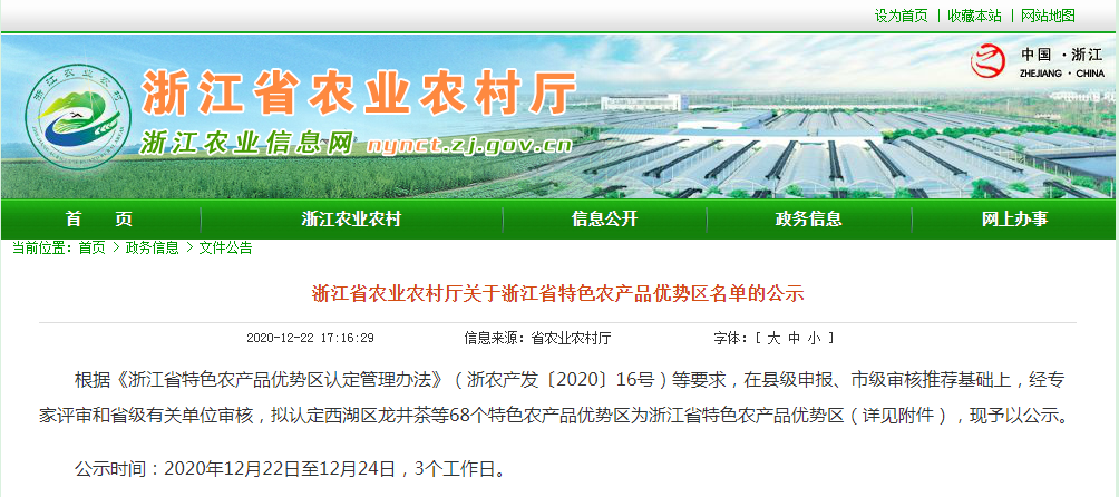 根據(jù)《浙江省特色農(nóng)產(chǎn)品優(yōu)勢(shì)區(qū)認(rèn)定管理辦法》(浙農(nóng)產(chǎn)發(fā)〔2020〕16號(hào))等要求,在縣級(jí)申報(bào)、市級(jí)審核推薦基礎(chǔ)上,經(jīng)專家評(píng)審和省級(jí)有關(guān)單位審核,擬認(rèn)定西湖區(qū)龍井茶......