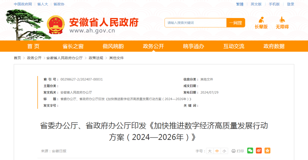 近期,中共安徽省委辦公廳、安徽省人民政府辦公廳印發(fā)了《加快推進(jìn)數(shù)字經(jīng)濟(jì)高質(zhì)量發(fā)展行動(dòng)方案(2024-2026年)》,并發(fā)出通知,要求各地各部門(mén)結(jié)合實(shí)際認(rèn)真貫徹落......