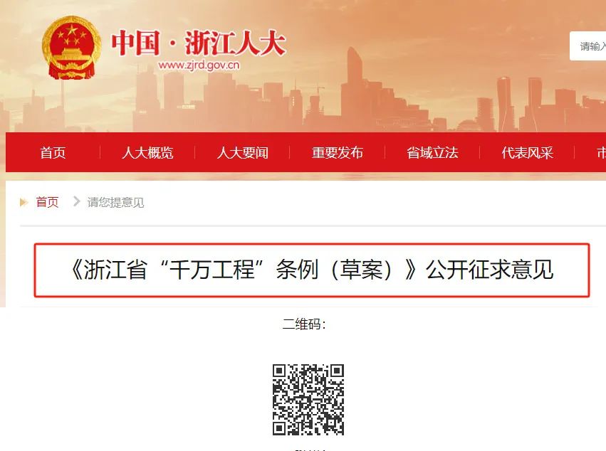 《浙江省“千萬(wàn)工程”條例(草案)》已經(jīng)省十四屆人大常委會(huì)第十一次會(huì)議審議?,F(xiàn)將草案和說(shuō)明予以公布。社會(huì)公眾可以掃描二維碼將意見(jiàn)反饋至省人大常委會(huì)法工委。意見(jiàn)征集......