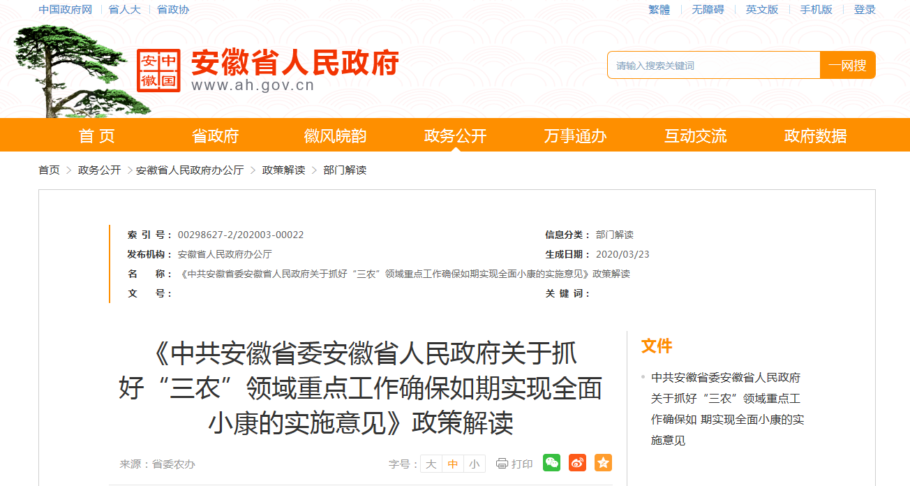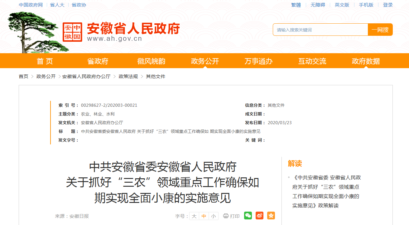 3月23日,省委、省政府公開(kāi)發(fā)布了《中共安徽省委 安徽省人民政府關(guān)于抓好“三農(nóng)”領(lǐng)域重點(diǎn)工作確保如期實(shí)現(xiàn)全面小康的實(shí)施意見(jiàn)》(皖發(fā)〔2020〕1號(hào),以下簡(jiǎn)稱《實(shí)......