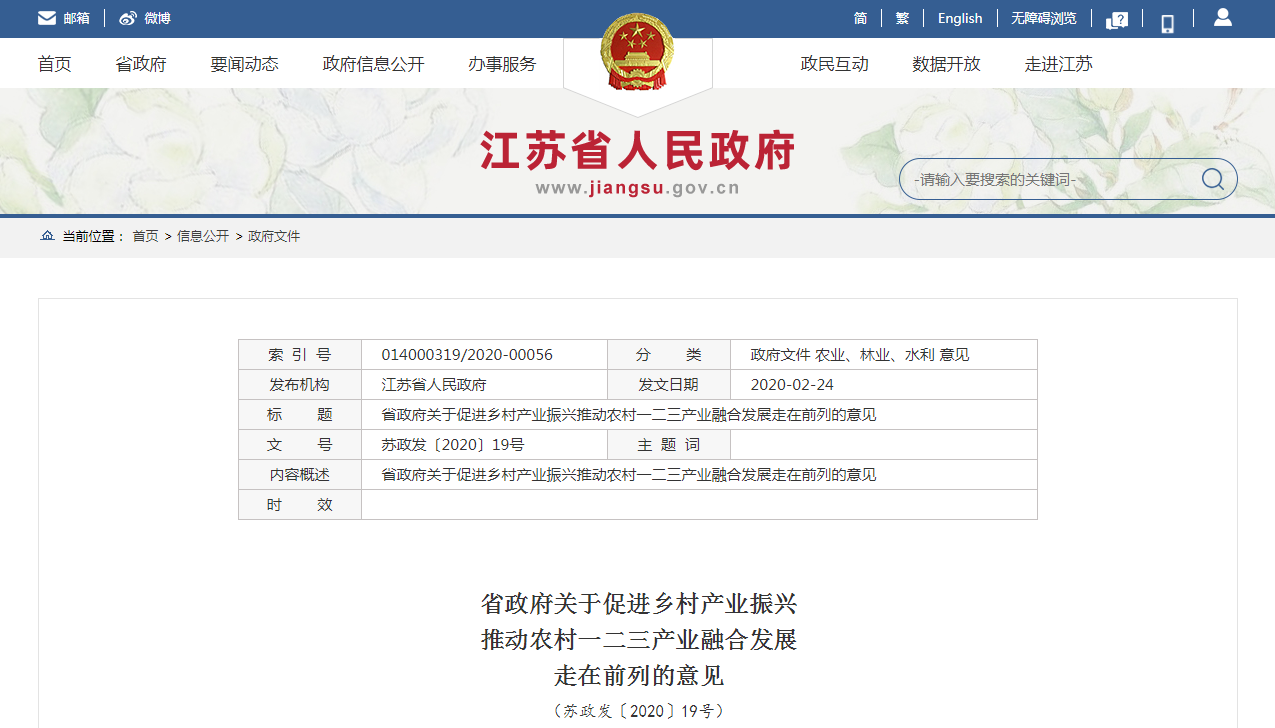 《江蘇省政府關(guān)于促進(jìn)鄉(xiāng)村產(chǎn)業(yè)振興 推動(dòng)農(nóng)村一二三產(chǎn)業(yè)融合發(fā)展走在前列的意見(jiàn)》近日出臺(tái)...