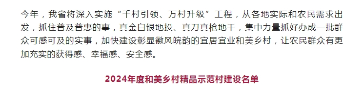 2024年度安徽省和美鄉(xiāng)村省級(jí)中心村建設(shè)名單已印發(fā),共有850個(gè)中心村入選,建設(shè)周期18個(gè)月。加快建設(shè)彰顯徽風(fēng)皖韻的宜居宜業(yè)和美鄉(xiāng)村,是推進(jìn)安徽農(nóng)業(yè)農(nóng)村現(xiàn)代化的......