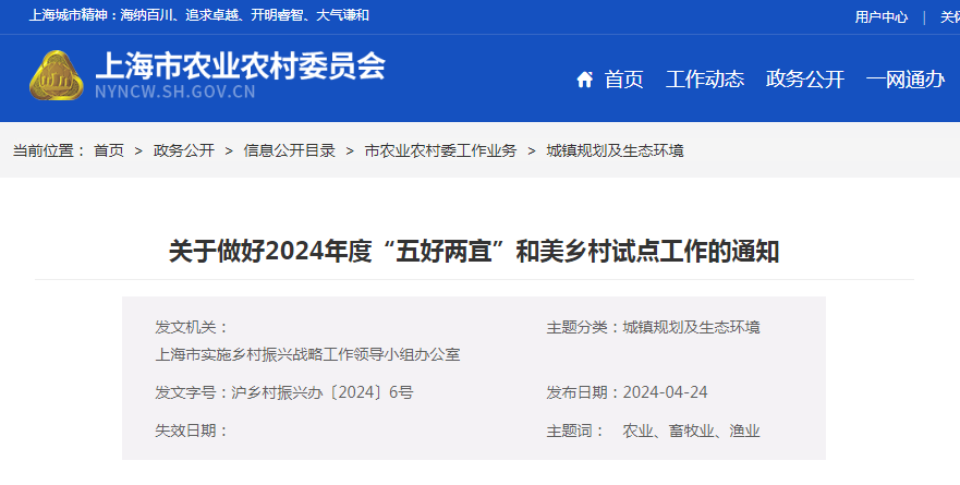 相關(guān)涉農(nóng)區(qū)實(shí)施鄉(xiāng)村振興戰(zhàn)略工作領(lǐng)導(dǎo)小組辦公室:按照《關(guān)于印發(fā)〈上海市2024年“五好兩宜”和美鄉(xiāng)村試點(diǎn)工作方案〉的通知》(滬農(nóng)委〔2023〕408號(hào))工作要求,......