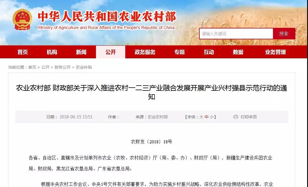 日前,農(nóng)業(yè)農(nóng)村部和財政部發(fā)布了關于深入推進農(nóng)村一二三產(chǎn)業(yè)融合發(fā)展開展產(chǎn)業(yè)興村強縣示范行動的通知。...