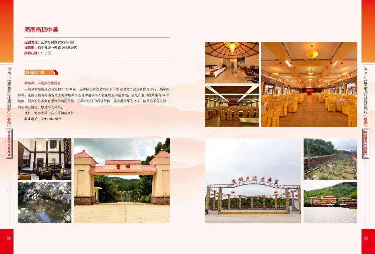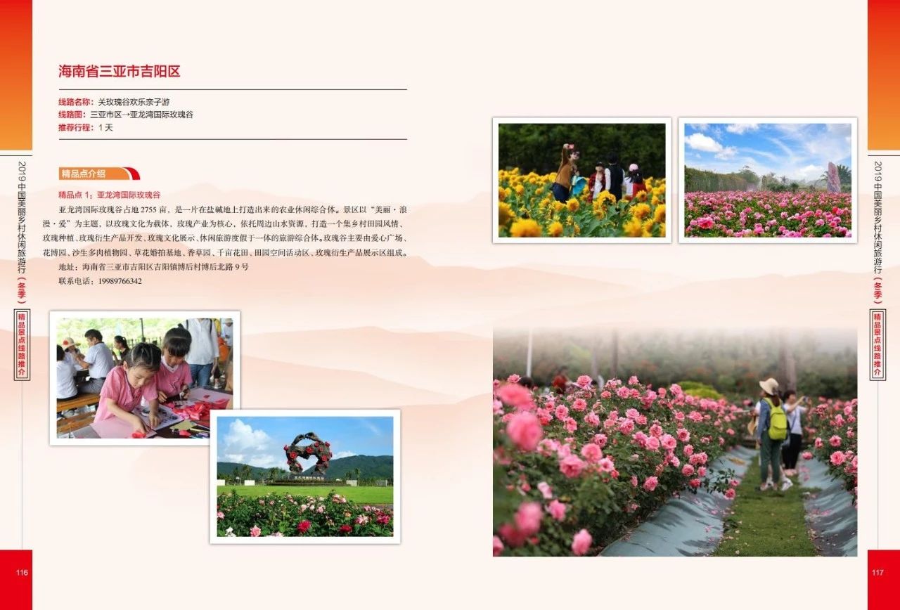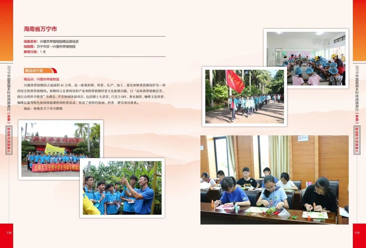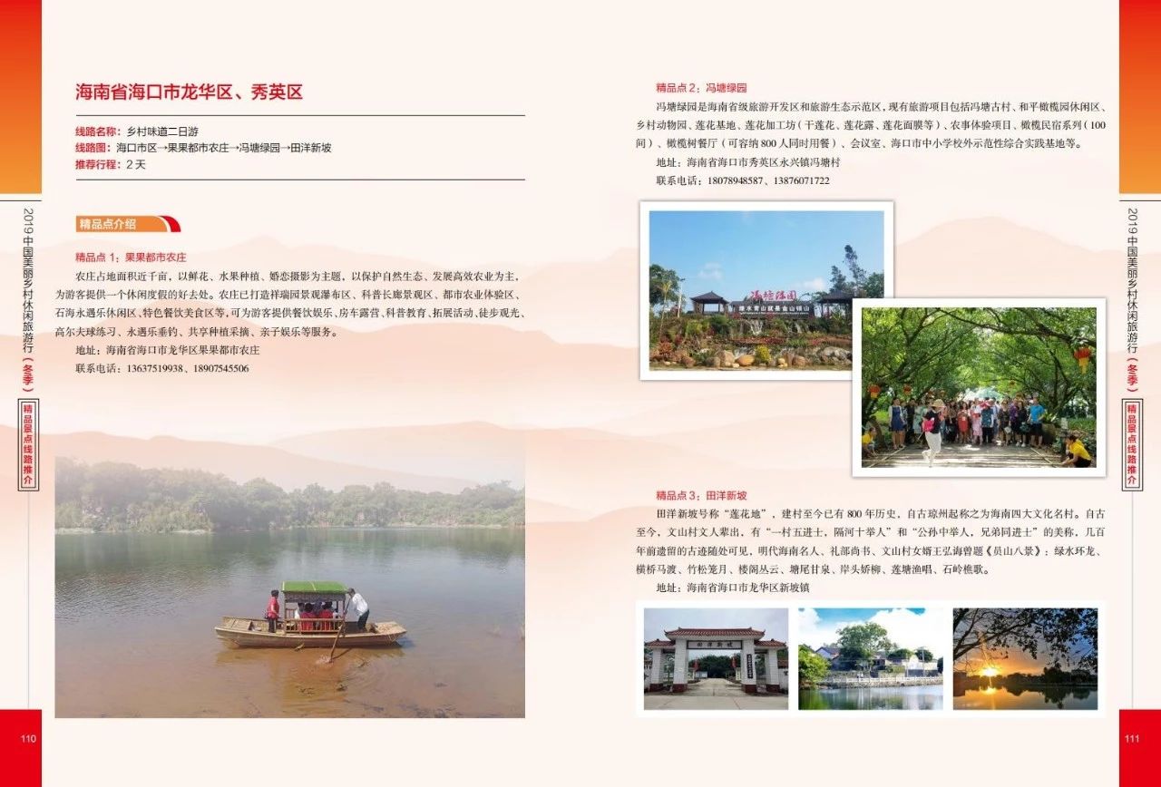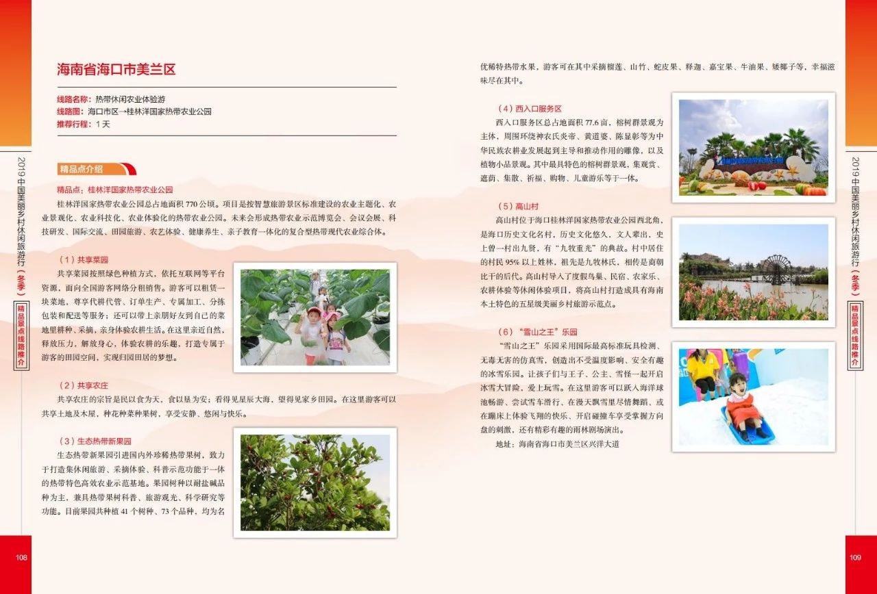 12月24日,2019中國(guó)美麗鄉(xiāng)村休閑旅游行(冬季)推介活動(dòng)在海南省瓊海市博鰲鎮(zhèn)舉辦,發(fā)布休閑農(nóng)業(yè)和鄉(xiāng)村旅游冬季精品旅游線路100條、景點(diǎn)273個(gè)。這是農(nóng)業(yè)農(nóng)村部鄉(xiāng)村休閑旅游“春觀花”“夏納涼”“秋采摘”“冬農(nóng)趣”系列推介活動(dòng)中的冬季主題活動(dòng)。至此,2019年四季活動(dòng)共推介線路410條、景點(diǎn)1300個(gè),精品景點(diǎn)線路37條。
