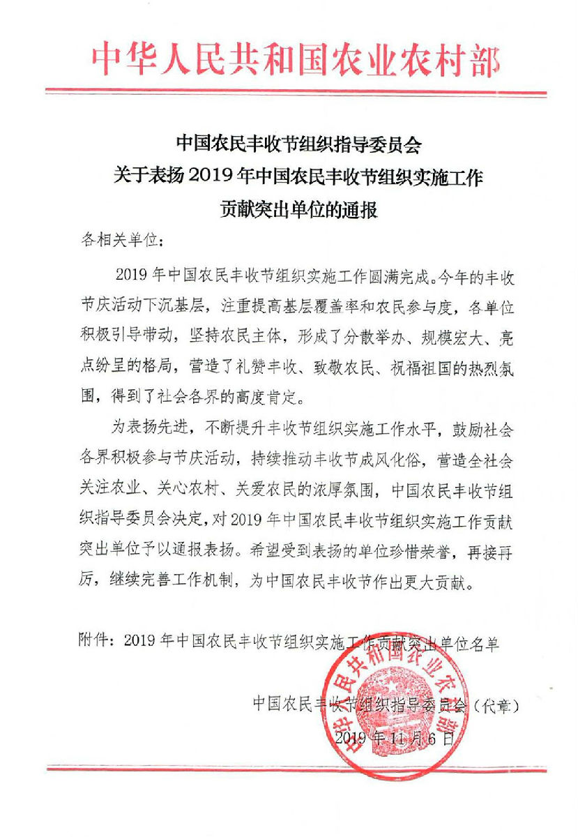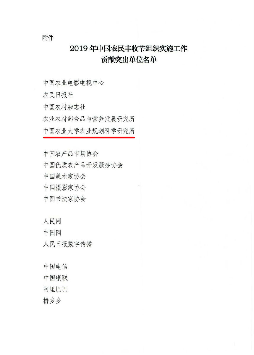 圖:由農(nóng)業(yè)農(nóng)村部牽頭組織成立的中國農(nóng)民豐收節(jié)組織指導委員會,對中國農(nóng)業(yè)大學農(nóng)業(yè)規(guī)劃科學研究所、中國銀聯(lián)等2019年豐收節(jié)期間貢獻突出單位予以表彰