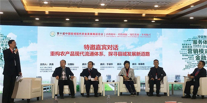 最后是特邀嘉賓對話環(huán)節(jié),北京工商大學(xué)教授、中國農(nóng)業(yè)展覽協(xié)會農(nóng)產(chǎn)品電商工作委員會主任洪濤擔(dān)任此環(huán)節(jié)的主持人,對話圍繞“重構(gòu)農(nóng)產(chǎn)品現(xiàn)代流通體系,探尋縣域發(fā)展新道路”這一主題展開討論。農(nóng)業(yè)農(nóng)村部市場與信息化司品牌與流通促進處副處長沈國際,中國農(nóng)業(yè)大學(xué)教授、農(nóng)業(yè)規(guī)劃科學(xué)研究所所長、中農(nóng)富通首席專家張?zhí)熘?,中商商業(yè)經(jīng)濟研究中心研究員于淑華,山西省農(nóng)業(yè)農(nóng)村廳果業(yè)總站站長馮耀斌,北京工商大學(xué)區(qū)域金融工程研究中心主任、中國區(qū)域經(jīng)濟學(xué)會區(qū)域金融專業(yè)委員會主任委員楊德勇,各位嘉賓分別從實踐的角度出發(fā),結(jié)合具體情況,為我們分享了如何重構(gòu)農(nóng)產(chǎn)品現(xiàn)代流通體系,探尋縣域發(fā)展新道路。
