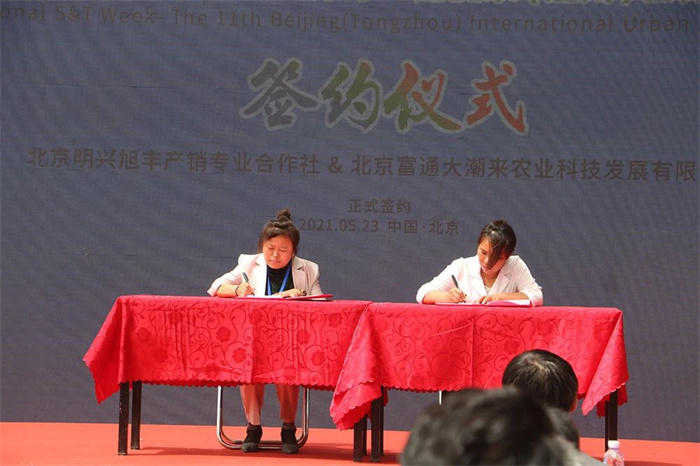 內(nèi)蒙古蒙牛圣牧高科乳品有限公司、北京明興旭豐產(chǎn)銷專業(yè)合作社、河北一航新能源科技有限公司分別與北京富通大潮來農(nóng)業(yè)科技發(fā)展有限公司簽署合作協(xié)議。