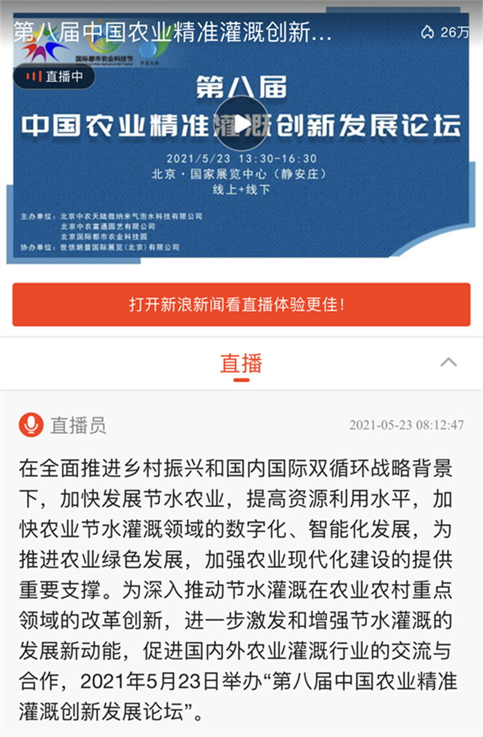 2021年5月23日下午,由北京中農天陸微納米氣泡水科技有限公司(簡稱“中農天陸”)、北京中農富通園藝有限公司、北京國際都市農業(yè)科技園共同主辦的“第八屆中國農業(yè)精準灌溉創(chuàng)新發(fā)展論壇”圓滿召開。