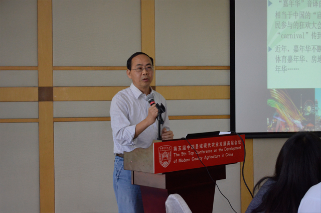 張?zhí)熘L介紹了“新常態(tài)下我國農(nóng)業(yè)綜合體發(fā)展研究”,指出新常態(tài)下、“十三五”時期需把產(chǎn)業(yè)鏈、價值鏈等現(xiàn)代產(chǎn)業(yè)組織方式引入農(nóng)業(yè),開發(fā)多功能價值,促進一二三產(chǎn)業(yè)融合互動;農(nóng)業(yè)綜合體為一定地域范圍內(nèi),以農(nóng)業(yè)為依托,集休閑、體驗、創(chuàng)意、研發(fā)、地產(chǎn)、會展、博覽等三種以上相關(guān)功能為一體,在農(nóng)業(yè)生產(chǎn)及產(chǎn)業(yè)經(jīng)營的同時,展現(xiàn)農(nóng)業(yè)文化和農(nóng)村生活,形成一個多功能、復(fù)合型、創(chuàng)新型的產(chǎn)業(yè)經(jīng)濟綜合體。
