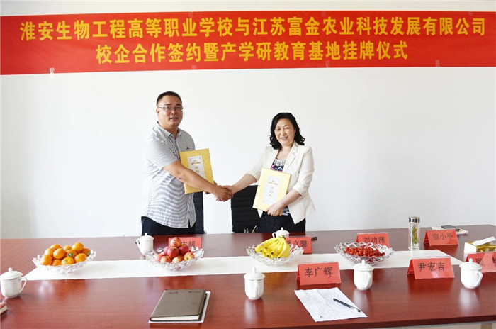 隨后,江蘇富金農(nóng)業(yè)科技發(fā)展有限公司總經(jīng)理房志超和淮安生物工程高等職業(yè)學(xué)校副校長趙守東共同為儀式揭牌,并與副校長禹立馨簽訂了校企合作協(xié)議。