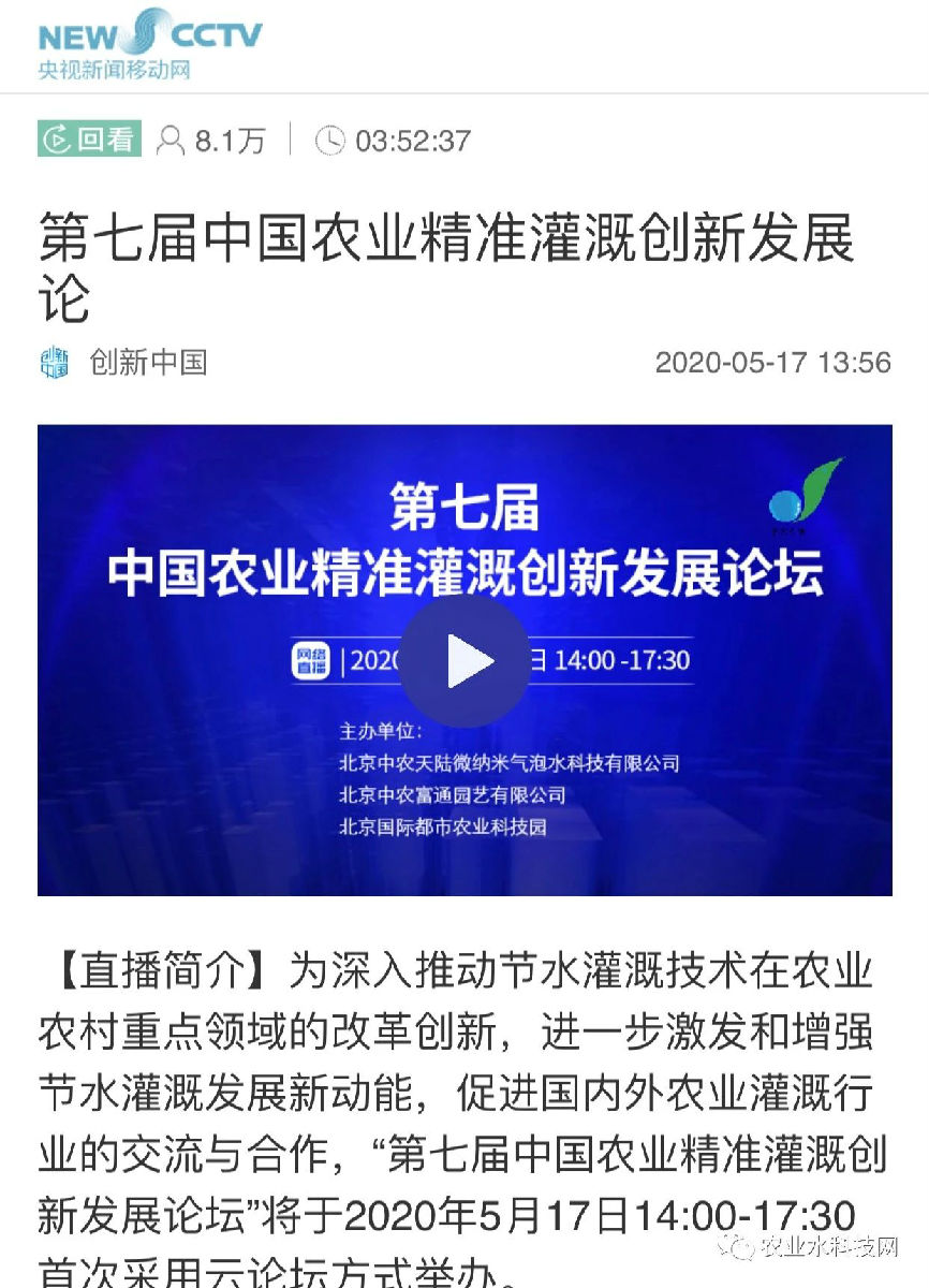 ?2020年5月17日下午,由北京中農(nóng)富通園藝有限公司、北京中農(nóng)天陸微納米氣泡水科技有限公司(簡(jiǎn)稱“中農(nóng)天陸”)、北京國(guó)際都市農(nóng)業(yè)科技園共同主辦的“第七屆中國(guó)農(nóng)業(yè)精準(zhǔn)灌溉創(chuàng)新發(fā)展論壇”線上論壇順利召開。