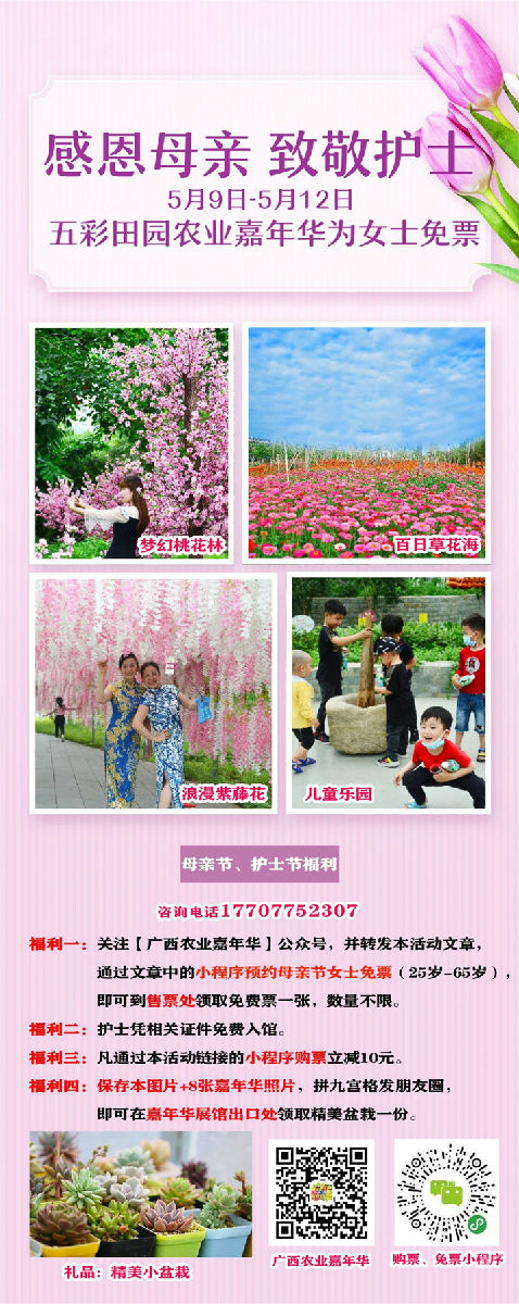 ▼濃情五月將迎來了母親節(jié)(5月10日)和國際護(hù)士節(jié)(5月12日),廣西玉林“五彩田園”農(nóng)業(yè)嘉年華給世界上最可愛的兩個(gè)人送上最誠摯的祝福和最大的福利。一起看農(nóng)藝高科、游浪漫花海、享農(nóng)耕體驗(yàn)、品田園名果。詳情請戳?感恩母親,致敬護(hù)士!傳遞愛心,五彩田園農(nóng)業(yè)嘉年華為女士免票!女士免票!