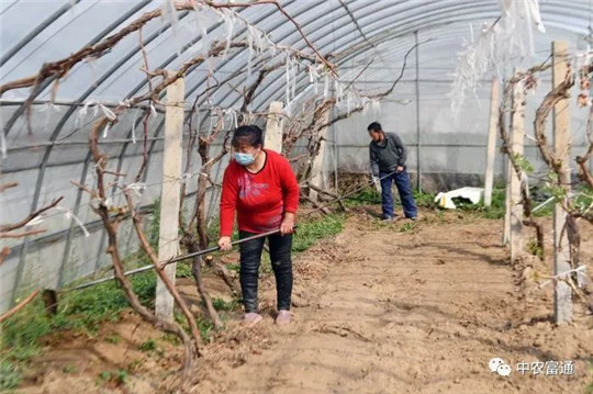 ▼4月16日北京青年報(bào)記者走進(jìn)中農(nóng)富通位于通州區(qū)潞城鎮(zhèn)賈后疃村西的科研示范基地—北京國(guó)際都市農(nóng)業(yè)科技園,工作人員正在棚里種植茄子、給梨樹(shù)疏花、為無(wú)花果殺菌、給葡萄園除雜草等。圖為孫師傅在給梨樹(shù)疏花。他說(shuō):“將一束花里中間的花去掉只留兩個(gè)邊花,用來(lái)保證梨的品質(zhì)?!?/span>