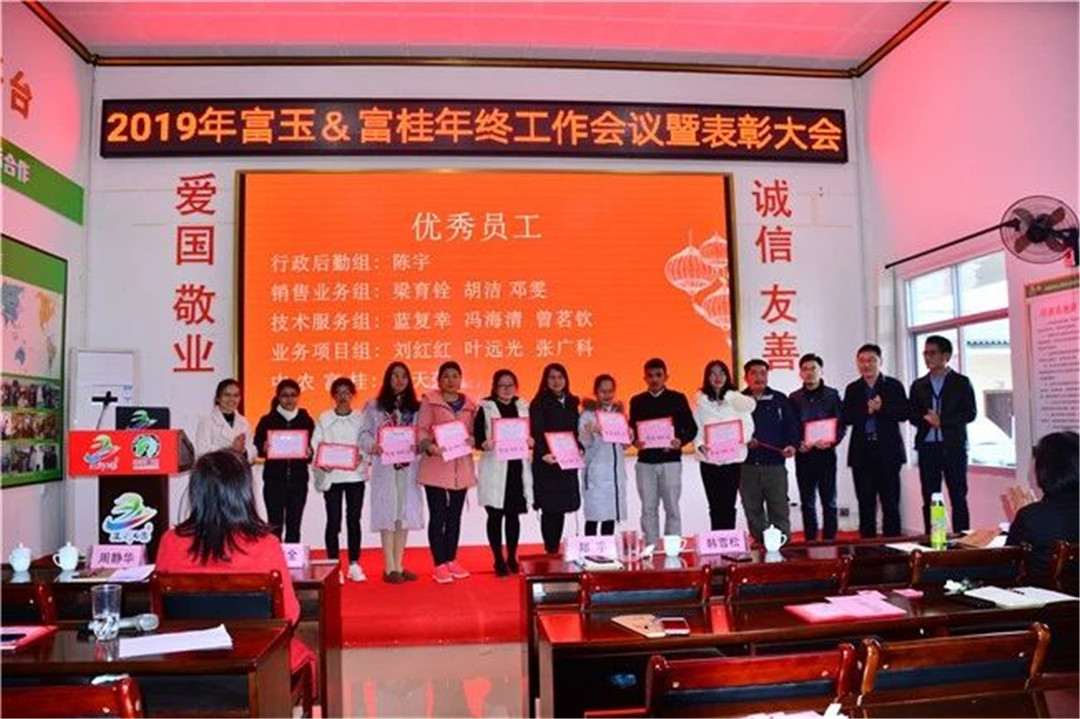▼1月17日,廣西中農富玉&廣西中農富桂公司舉行2019年年終工作會議暨表彰大會,對2019年進行工作總結,對2020年進行展望,并對2019年先進集體和個人進行了表彰。晚上舉行了精彩紛呈的迎春晚會,豐富多彩的節(jié)目展示了富玉員工火熱的激情,2020中農富玉定將再創(chuàng)新輝煌!