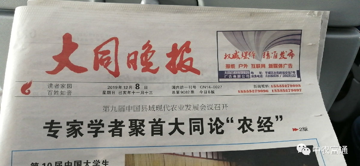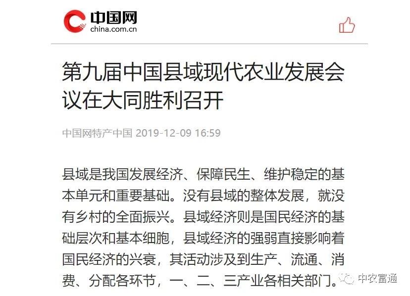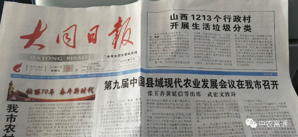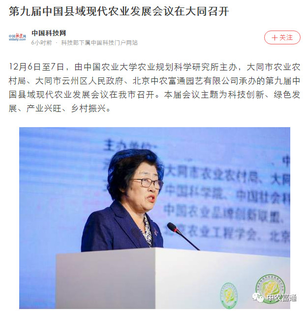 ▼12月6日-7日,第九屆中國縣域現(xiàn)代農(nóng)業(yè)發(fā)展會(huì)議在國家歷史文化名城——山西大同成功舉辦。本次會(huì)議由中國農(nóng)業(yè)大學(xué)農(nóng)業(yè)規(guī)劃科學(xué)研究所主辦,大同市農(nóng)業(yè)農(nóng)村局、大同市云州區(qū)人民政府、北京中農(nóng)富通園藝有限公司承辦,會(huì)議主題為“科技創(chuàng)新、綠色發(fā)展、產(chǎn)業(yè)興旺、鄉(xiāng)村振興”。來自國內(nèi)外農(nóng)業(yè)科研院校的專家教授、各地主管農(nóng)業(yè)的領(lǐng)導(dǎo)、農(nóng)業(yè)重點(diǎn)園區(qū)的主管領(lǐng)導(dǎo)、國家級(jí)農(nóng)業(yè)產(chǎn)業(yè)化企業(yè)、國內(nèi)外知名涉農(nóng)企業(yè)負(fù)責(zé)人等共700余人參加會(huì)議,6日線上直播觀看人數(shù)高達(dá)1.17萬人。會(huì)議同期舉辦了七場(chǎng)專題研討會(huì)、慶祝新中國成立70周年·2019鄉(xiāng)村振興優(yōu)秀案例展、縣域現(xiàn)代農(nóng)業(yè)發(fā)展論文征集、名稀特優(yōu)農(nóng)產(chǎn)品展示等。本次會(huì)議受到與會(huì)嘉賓高度稱贊,取得圓滿成功,中國網(wǎng)、中國科技網(wǎng)、大同日?qǐng)?bào)、大同晚報(bào)等多家媒體紛紛給予報(bào)道。