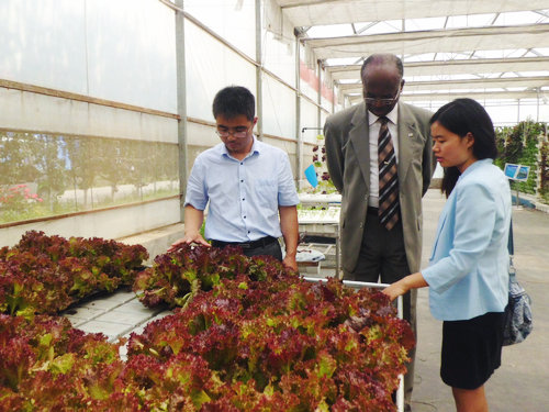 科技園場(chǎng)長(zhǎng)傅常智熱情接待了大使。在介紹園區(qū)規(guī)劃總體情況之后,傅場(chǎng)長(zhǎng)帶領(lǐng)大使參觀(guān)了展示新品種、新技術(shù)的溫室,詳細(xì)介紹了水培、潮汐式灌溉等現(xiàn)代栽培模式,并表示通過(guò)農(nóng)業(yè)物聯(lián)網(wǎng)和各種大田機(jī)械的運(yùn)用,園區(qū)已經(jīng)基本實(shí)現(xiàn)了信息化與機(jī)械化。經(jīng)過(guò)在園區(qū)展示區(qū)域的參觀(guān),大使更深刻理解了北京國(guó)際都市農(nóng)業(yè)科技園高效生產(chǎn)和科研推廣展示的功能定位。