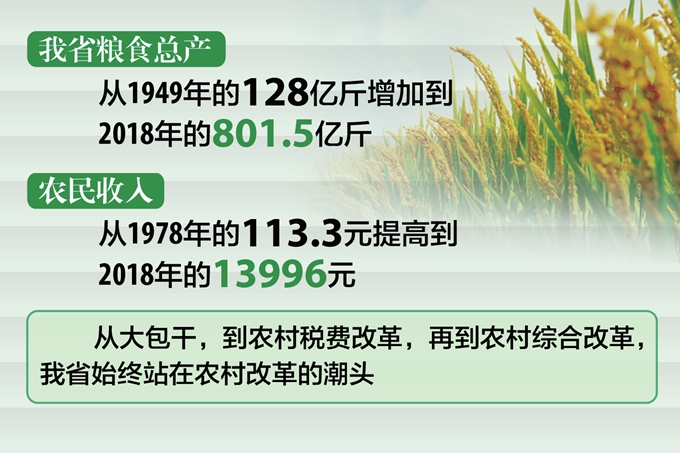 2018年,我省糧食總產(chǎn)從1949年的128億斤增加到801.5億斤。 1956年,全省農(nóng)業(yè)總產(chǎn)值僅有區(qū)區(qū)24.1億元,而2018年,這個(gè)數(shù)字已達(dá)到4672.7億元。與此同時(shí),“菜籃子”更豐富了。去年全省生豬出欄2837.4萬(wàn)頭,肉類(lèi)總產(chǎn)量421.7萬(wàn)噸,禽蛋產(chǎn)量158.3萬(wàn)噸,牛奶產(chǎn)量30.8萬(wàn)噸,均比建國(guó)初期大踏步增長(zhǎng)。