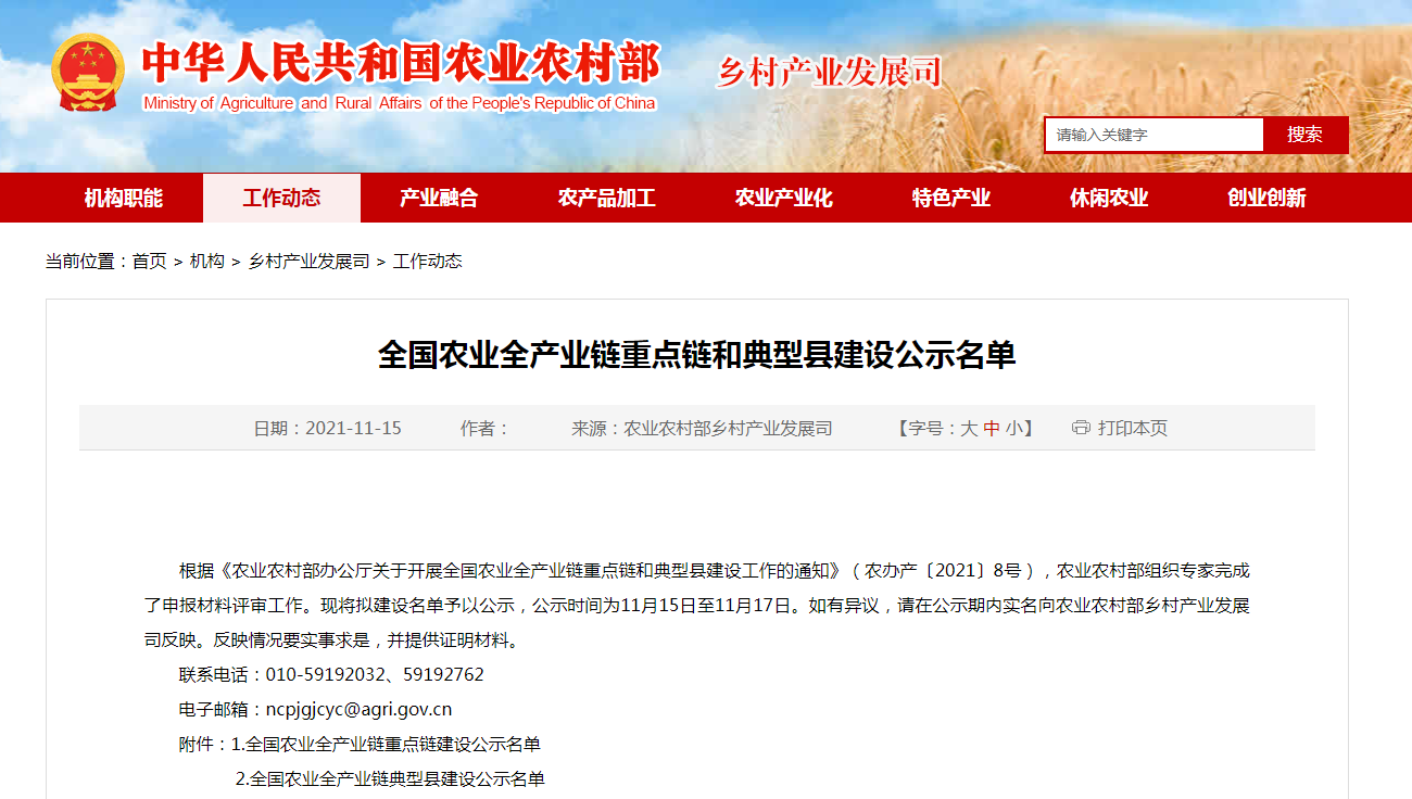 根據《農業(yè)農村部辦公廳關于開展全國農業(yè)全產業(yè)鏈重點鏈和典型縣建設工作的通知》(農辦產〔2021〕8號),農業(yè)農村部組織專家完成了申報材料評審工作?,F將擬建設名單......
