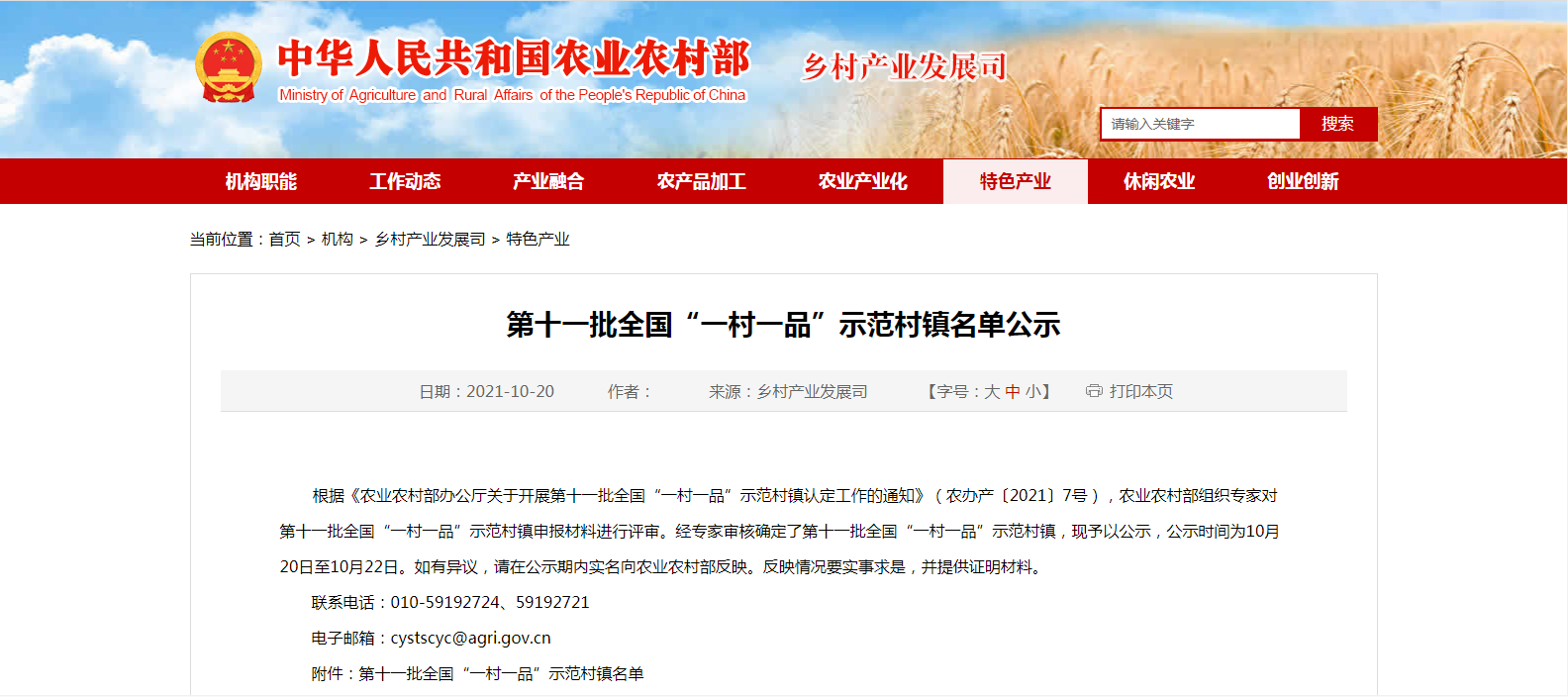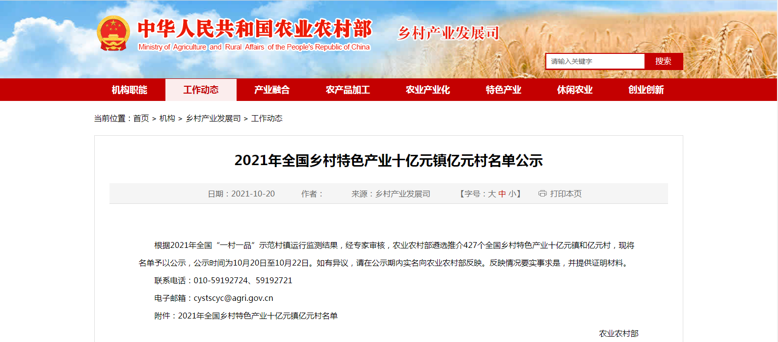 根據(jù)2021年全國“一村一品”示范村鎮(zhèn)運(yùn)行監(jiān)測結(jié)果,經(jīng)專家審核,農(nóng)業(yè)農(nóng)村部遴選推介427個(gè)全國鄉(xiāng)村特色產(chǎn)業(yè)十億元鎮(zhèn)和億元村,現(xiàn)將名單予以公示,公示時(shí)間為10......