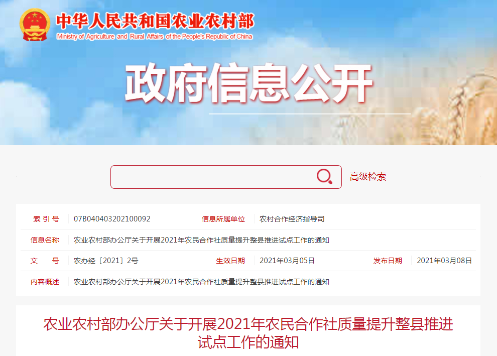 為貫徹落實黨中央、國務院關于突出抓好農民合作社發(fā)展的有關精神,2018年10月農業(yè)農村部啟動了農民合作社質量提升整縣推進試點工作,先后確定2批158個試點單位......