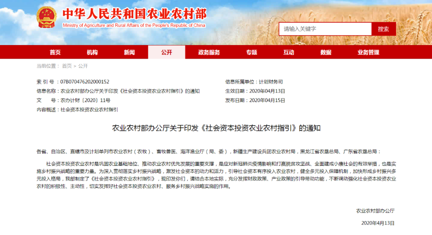 社會(huì)資本投資農(nóng)業(yè)農(nóng)村是鞏固農(nóng)業(yè)基礎(chǔ)地位、推動(dòng)農(nóng)業(yè)農(nóng)村優(yōu)先發(fā)展的重要支撐,是應(yīng)對(duì)新冠肺炎疫情影響和打贏脫貧攻堅(jiān)戰(zhàn)、全面建成小康社會(huì)的有效舉措,也是實(shí)施鄉(xiāng)村振興戰(zhàn)略......