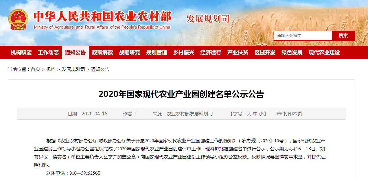 現(xiàn)將擬批準(zhǔn)創(chuàng)建名單進(jìn)行公示,公示期為4月16—18日。如有異議,請(qǐng)實(shí)名(單位主要負(fù)責(zé)人簽字并加蓋公章)向國(guó)家現(xiàn)代農(nóng)業(yè)產(chǎn)業(yè)園建設(shè)工作領(lǐng)導(dǎo)小組辦公室反映。...
