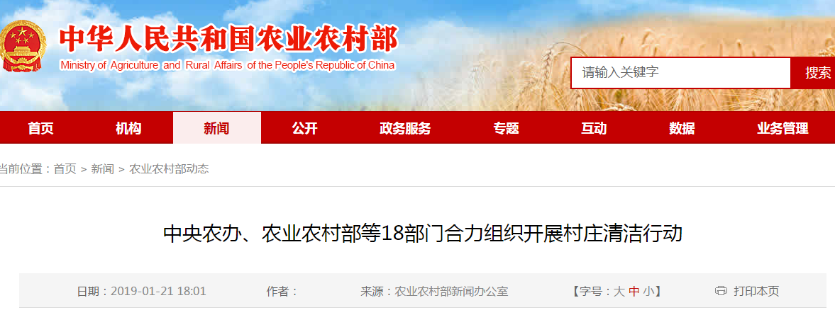 近日,中央農(nóng)辦、農(nóng)業(yè)農(nóng)村部、國(guó)家發(fā)展改革委、科技部、財(cái)政部、自然資源部、生態(tài)環(huán)境部等18個(gè)部門聯(lián)合印發(fā)了《農(nóng)村人居環(huán)境整治村莊清潔行動(dòng)方案》,組織開展村莊清潔行......