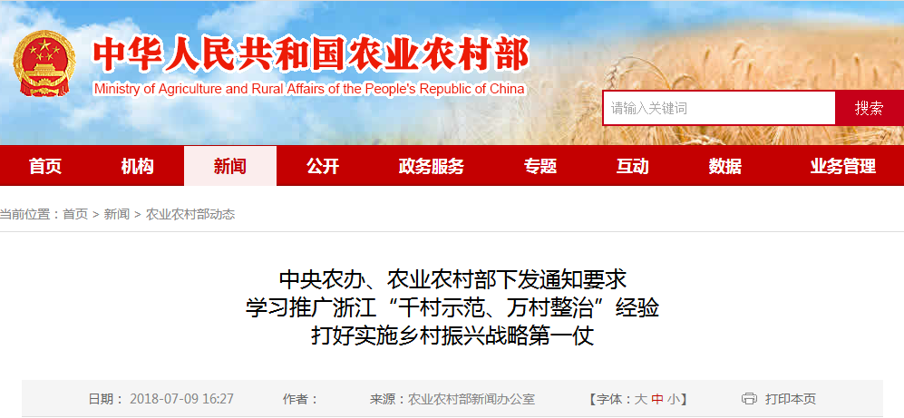 近日,中央農(nóng)辦、農(nóng)業(yè)農(nóng)村部下發(fā)《關(guān)于學(xué)習(xí)推廣浙江“千村示范、萬村整治”經(jīng)驗 深入推進農(nóng)村人居環(huán)境整治工作的通知》...