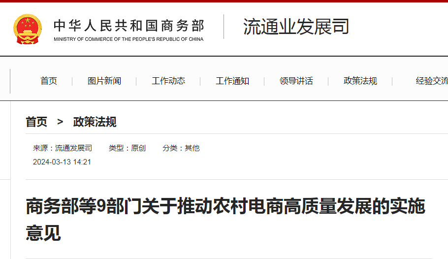 近日,商務(wù)部、中央網(wǎng)信辦、財(cái)政部、交通運(yùn)輸部、農(nóng)業(yè)農(nóng)村部、市場(chǎng)監(jiān)管總局、國(guó)家郵政局、共青團(tuán)中央、供銷合作總社聯(lián)合印發(fā)《關(guān)于推動(dòng)農(nóng)村電商高質(zhì)量發(fā)展的實(shí)施意見(jiàn)》?!?.....