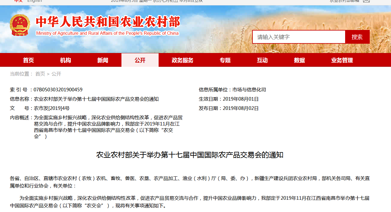 為全面實施鄉(xiāng)村振興戰(zhàn)略,深化農(nóng)業(yè)供給側(cè)結(jié)構(gòu)性改革,促進(jìn)農(nóng)產(chǎn)品貿(mào)易交流與合作,提升中國農(nóng)業(yè)品牌影響力,我部定于2019年11月在江西省南昌市舉辦第十七屆中國國際農(nóng)......
