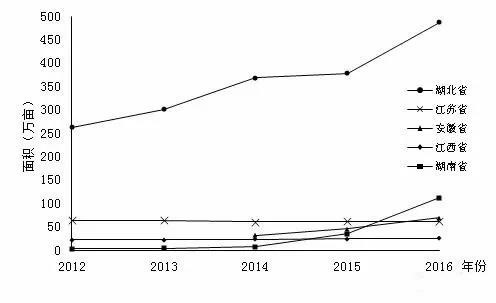圖2 2012-2016年五個主產(chǎn)省養(yǎng)殖面積變化情況