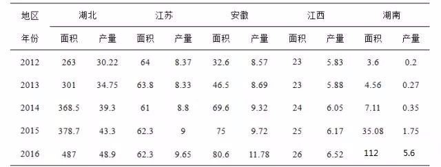 表1 2012-2016年五個主產(chǎn)省份小龍蝦養(yǎng)殖面積和產(chǎn)量情況 單位:萬畝/萬噸