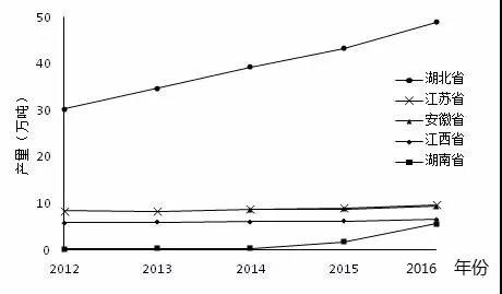 圖3 2012-2016年五個主產(chǎn)省養(yǎng)殖產(chǎn)量變化情況