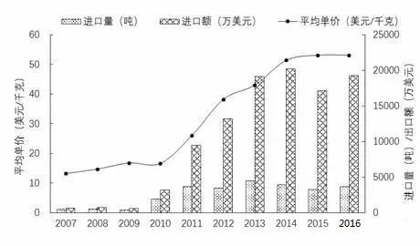 圖9 2007-2016年全國小龍蝦進(jìn)口情況