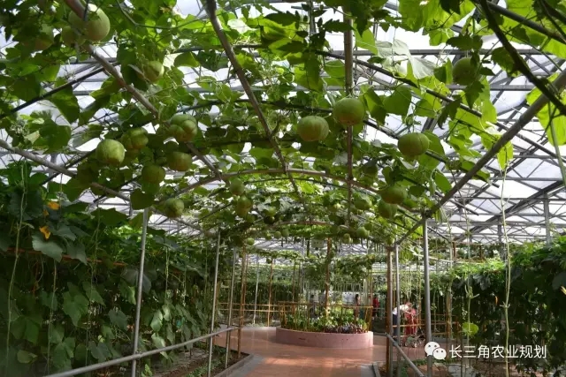 利用果實形態(tài)各異的觀賞瓜果類蔬菜構(gòu)建園區(qū),特別是利用各式各樣的棚架或長廊栽植藤本瓜果,讓其自然攀爬,形成瓜果滿廊的獨特景觀,既可以供人們休憩,也可以進行觀賞,是農(nóng)業(yè)觀光園中不可缺少的景觀之一,如觀賞葫蘆走廊、觀賞南瓜走廊、櫻桃番茄走廊、蛇瓜林等景觀。