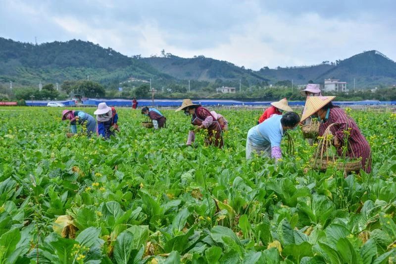 ▼在海峽兩岸(廣西玉林)農(nóng)業(yè)合作科技示范園(中農(nóng)富玉農(nóng)場)的蔬菜基地里,廣西中農(nóng)富玉國際農(nóng)業(yè)科技有限公司(簡稱中農(nóng)富玉)公司員工和農(nóng)戶,一起采摘新鮮蔬菜、稱重裝箱、裝車……這些新鮮蔬菜幾天后將送到湖北人民的餐桌。