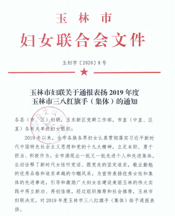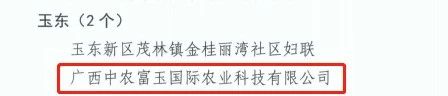 ▼為宣傳表揚(yáng)優(yōu)秀女性和集體的先進(jìn)事跡,引導(dǎo)和激勵(lì)廣大婦女在建設(shè)美麗玉林的偉大實(shí)踐中再立新功、再創(chuàng)佳績,經(jīng)過組織推薦和社會(huì)推薦,玉林市婦聯(lián)決定對(duì)2019年度玉林市三八紅旗手(集體)給予通報(bào)表揚(yáng)。經(jīng)各方推薦、嚴(yán)格評(píng)選。廣西中農(nóng)富玉國際農(nóng)業(yè)科技有限公司(以下稱中農(nóng)富玉)被授予“2019年度玉林市三八紅旗集體”榮譽(yù)稱號(hào)。