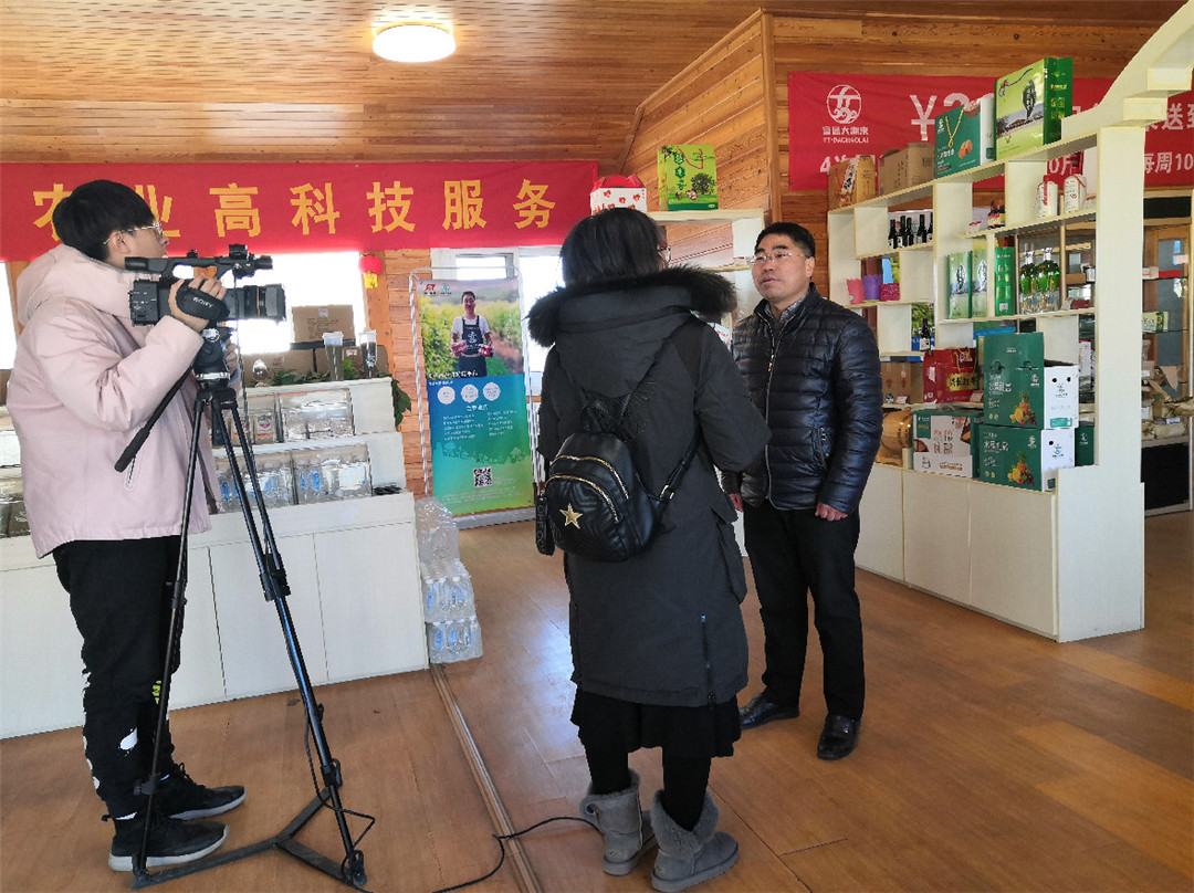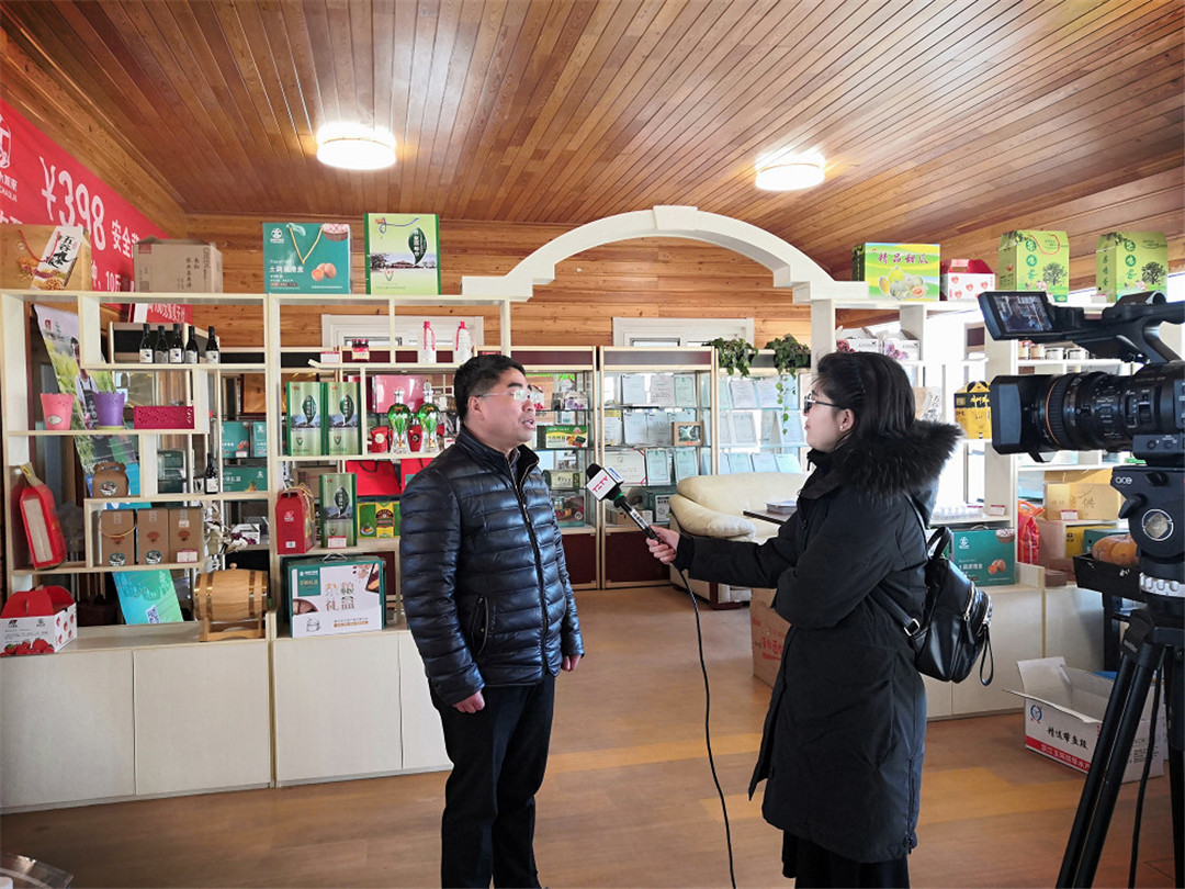 ▼近日,年關將近,為讓北京市民能過一個快樂祥和的春節(jié),北京富通大潮來農業(yè)科技有限公司準備了琳瑯滿目的年貨。圖為北京富通大潮來總經理亓德明接受通州電視臺采訪。