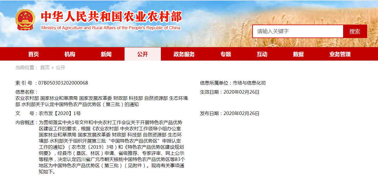 經(jīng)縣市(墾區(qū)、林區(qū))申請、省級推薦、專家評審、網(wǎng)上公示等程序,決定認(rèn)定四川省廣元市朝天核桃中國特色農(nóng)產(chǎn)品優(yōu)勢區(qū)等83個(gè)地區(qū)為中國特色農(nóng)產(chǎn)品優(yōu)勢區(qū)(第三批)(見附......