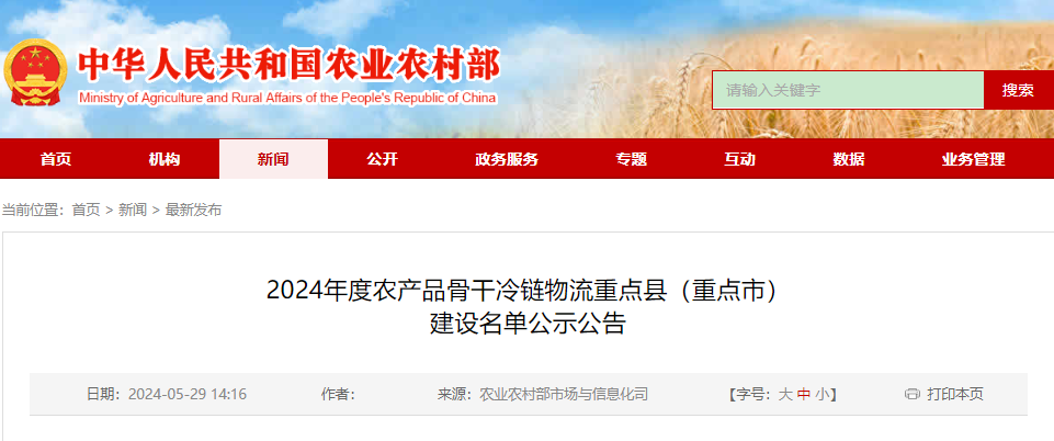 為落實《中華人民共和國國民經(jīng)濟和社會發(fā)展第十四個五年規(guī)劃和2035年遠景目標綱要》有關(guān)部署,我部組織完成了2024年度農(nóng)產(chǎn)品骨干冷鏈物流重點縣(重點市)綜合把關(guān)......